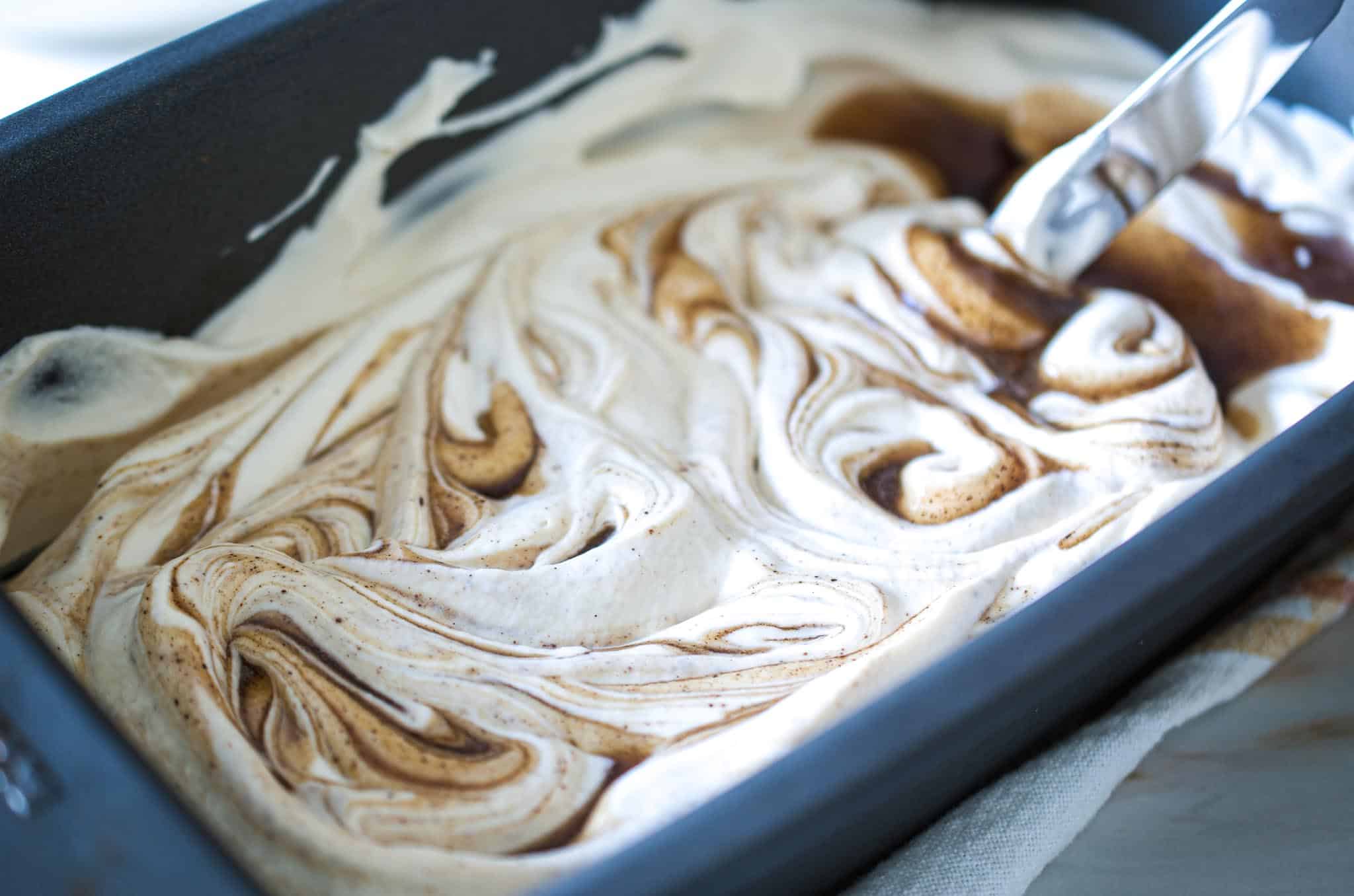 - Transfer half the ice cream mixture to the loaf pan, and with a blunt knife, swirl in half the maple cinnamon swirl mixture. Repeat with the remaining. Cover and freeze for 4 to six hours.