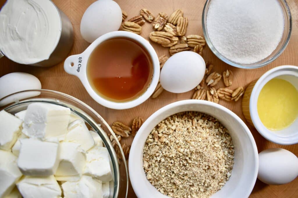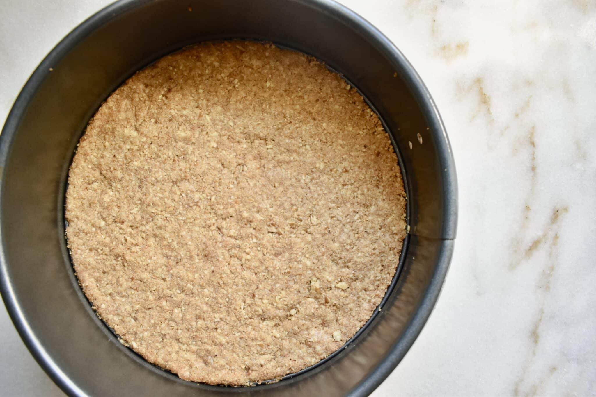 - For the crust – using a food processor or blender, crush enough graham crackers to yield 1/2 cup of crumbs. Crush enough pecans to yield 1/2 cup of crumbs. Mix crumbs with 3T melted butter and firmly press the mixture into the bottom of a 9 inch springform pan. Bake at 325 degrees for 10 minutes.