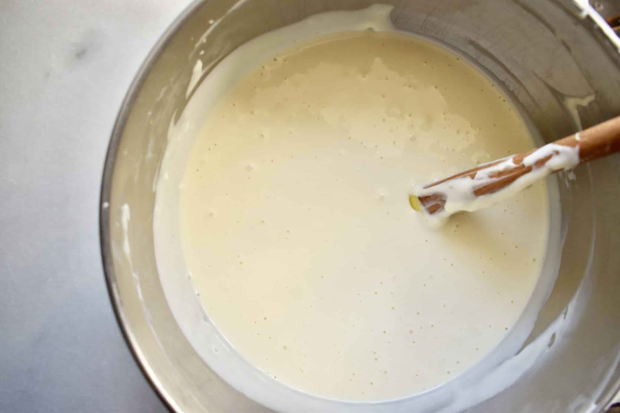 - For the filling – mix together cream cheese, sugar, and flour in the bowl of a stand mixer until well blended.