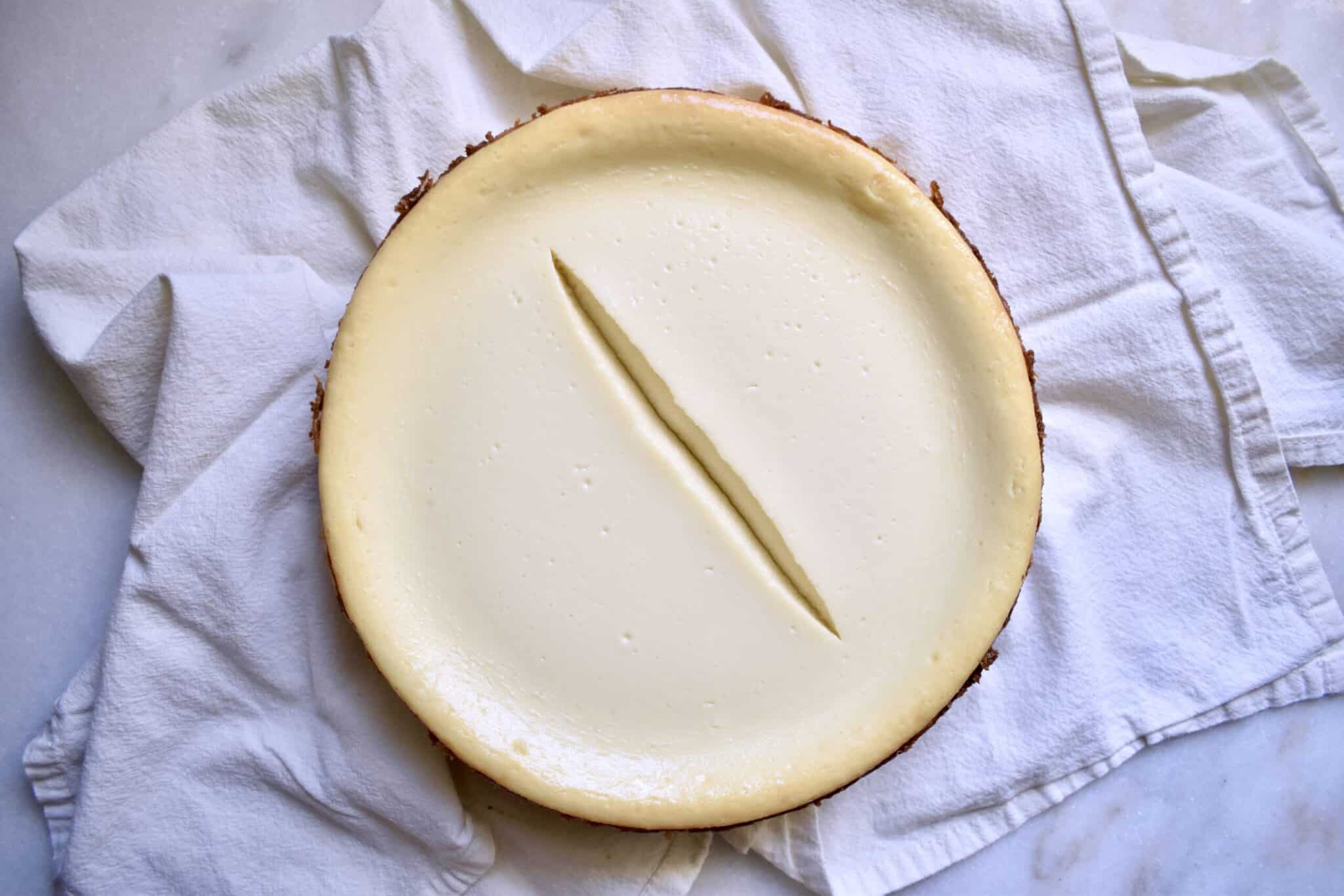 Cheesecakes are notorious for cracking on top, which usually happens during the cooling process. There are a few things you can do to help prevent it!