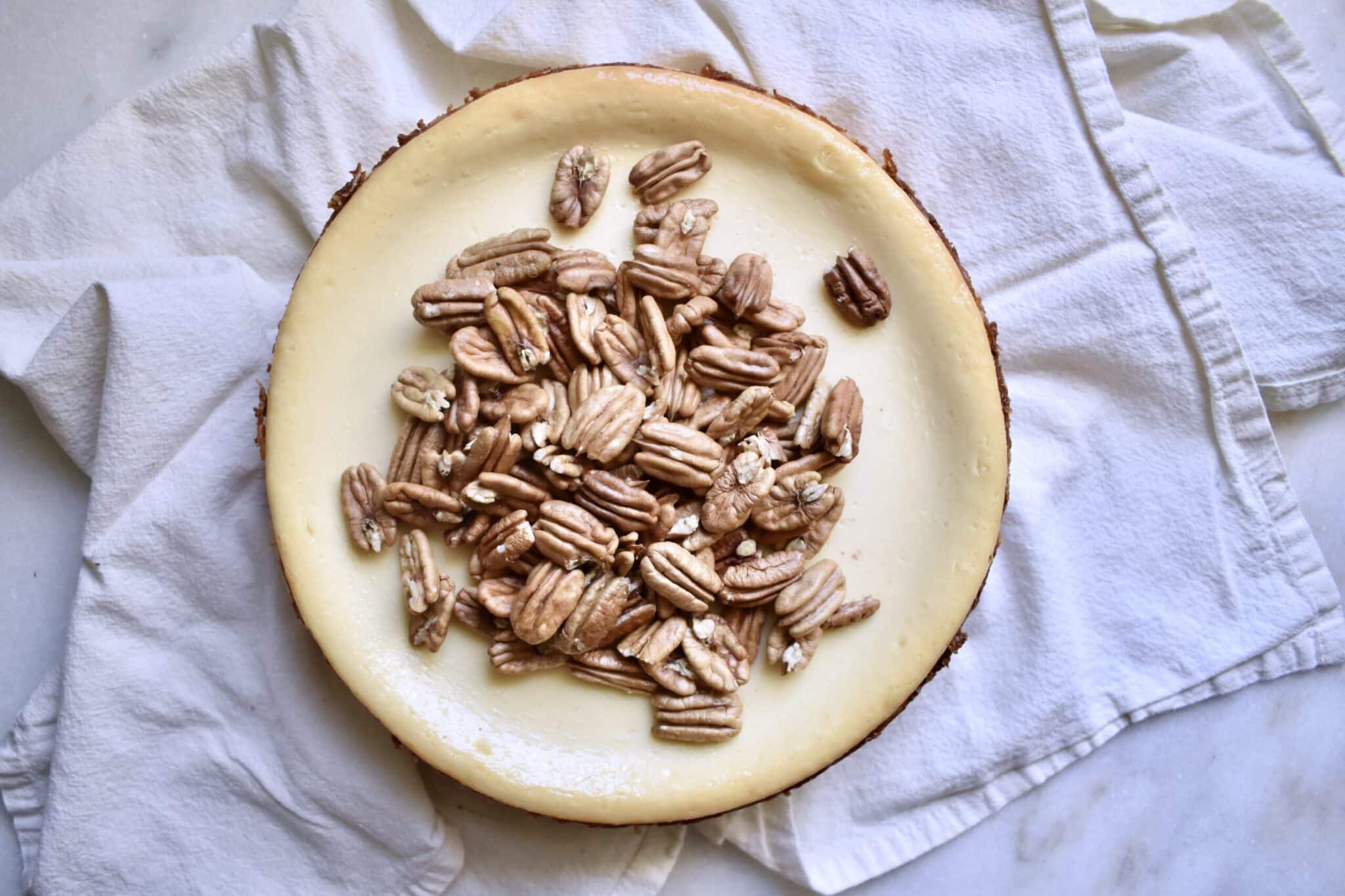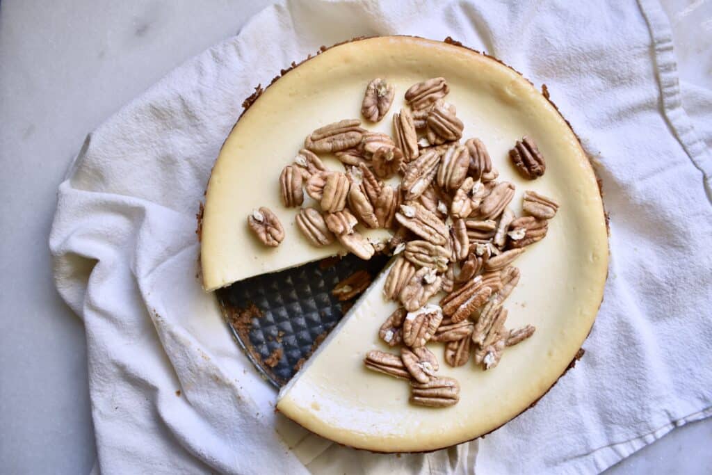 This cheesecake carries the perfect subtle, creamy maple flavor with a delicious crust of pecans and graham crackers and is topped with crunchy, toasted pecans and a simple maple drizzle.