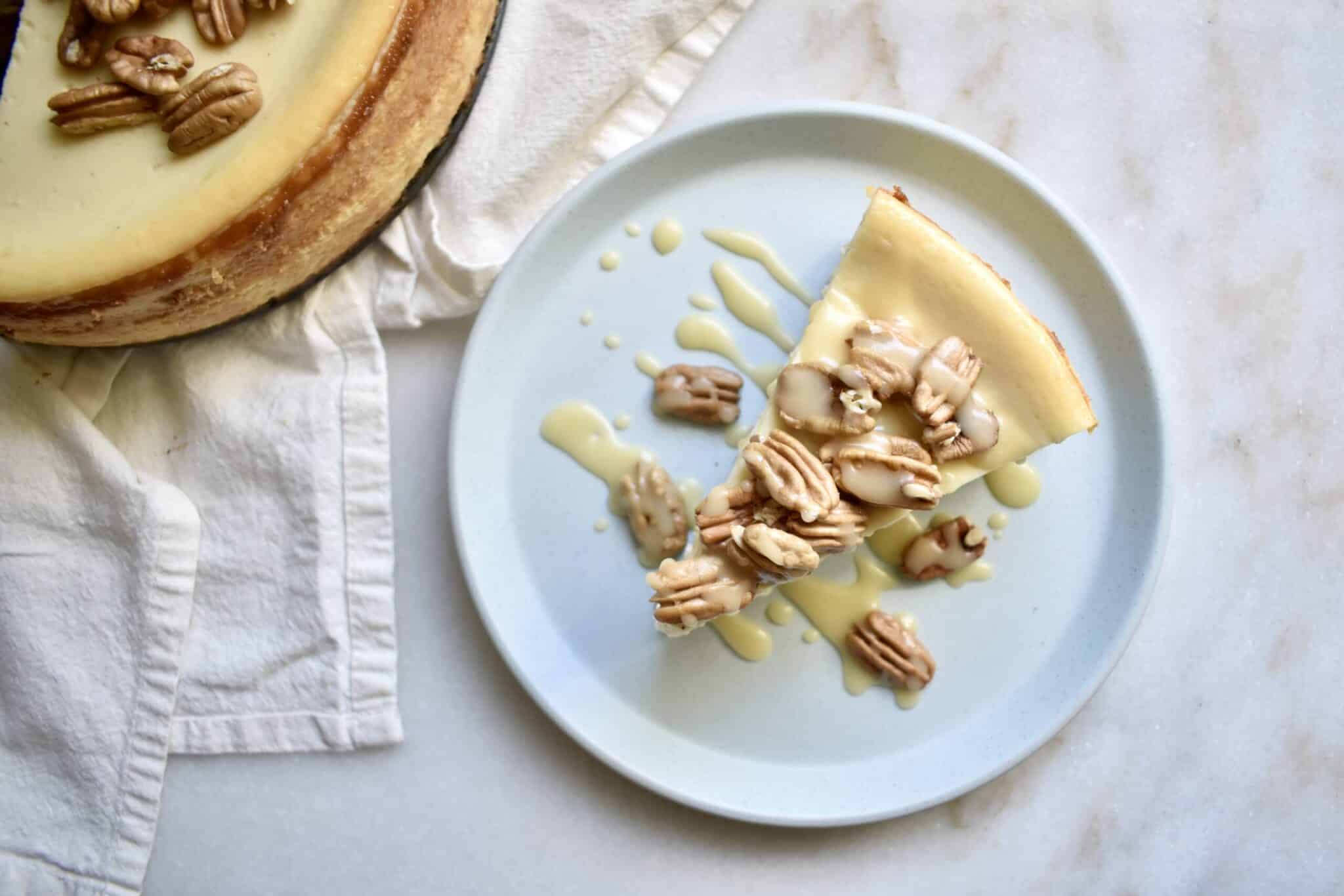 This cheesecake is deliciously simple as it is. But, here are some ideas if you would like to add a topping! Lightly toast some pecan halves in a skillet or in the oven for a nice crunch. Keep an eye on the pecans, as they toast quickly. For an extra punch of maple flavor, combine melted butter, maple syrup, powdered sugar, vanilla, and a pinch of salt for a yummy glaze.