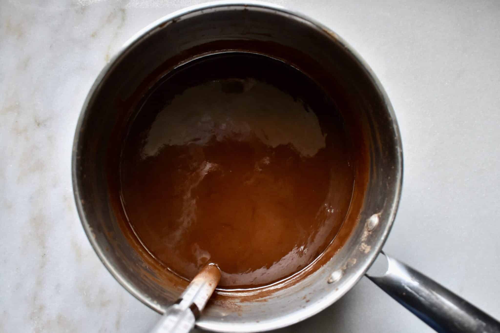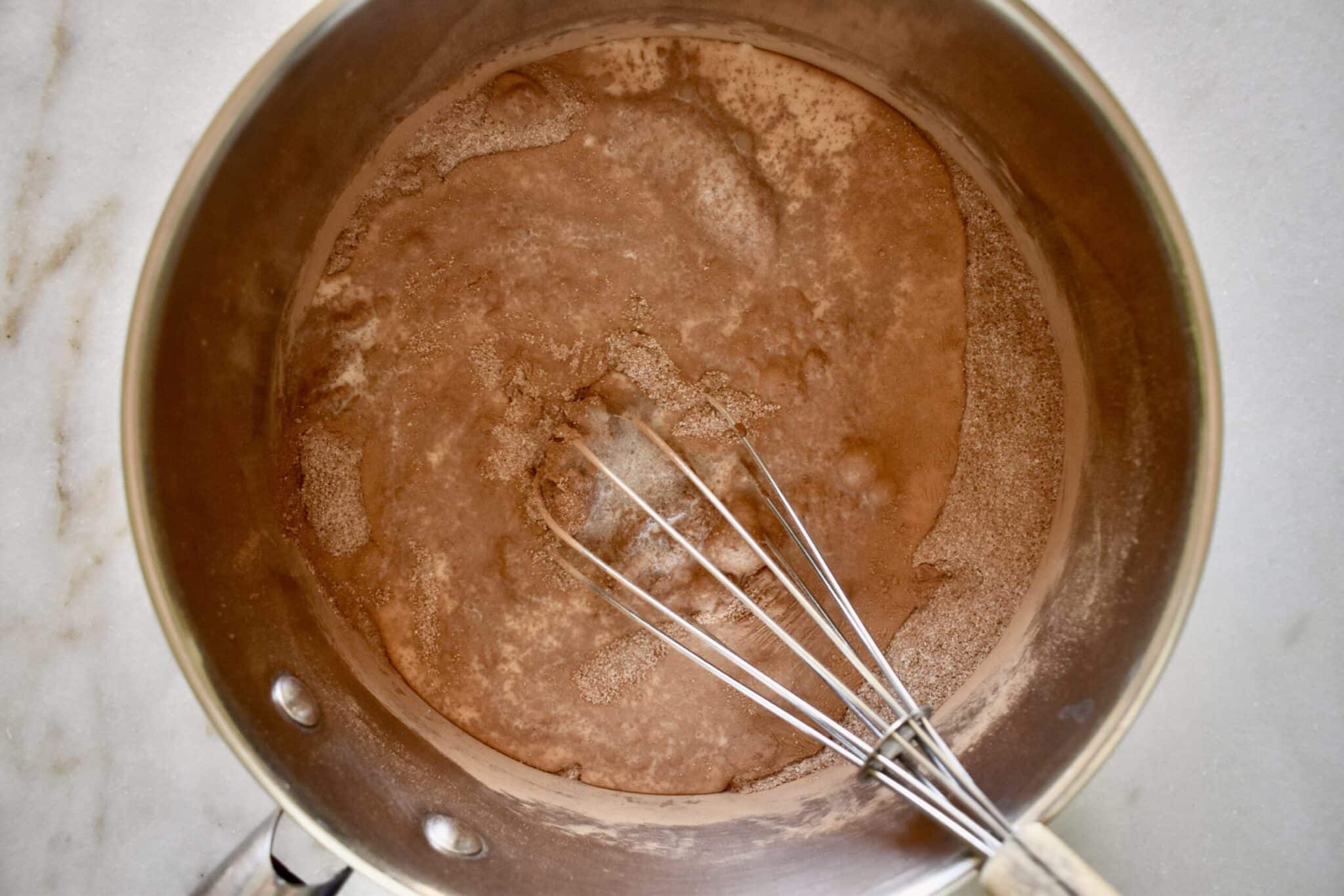 - In a heavy bottomed pan, whisk together the sugar, cocoa, and salt. Pour in the milk and whisk until smooth and well combined.
