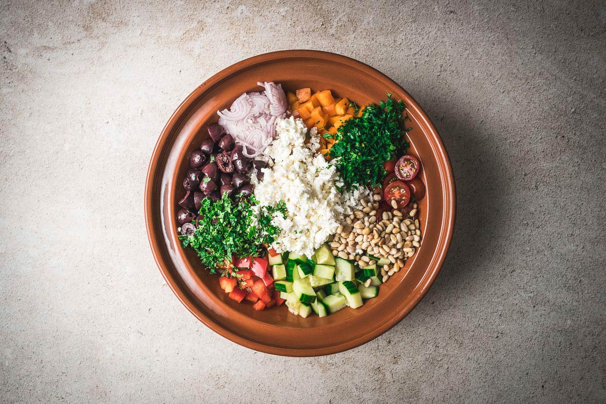 - Toss the salad – Add the cooled couscous, chopped vegetables, cheese, olives and herbs to a large mixing bowl or serving dish. Pour in dressing and toss it all together.