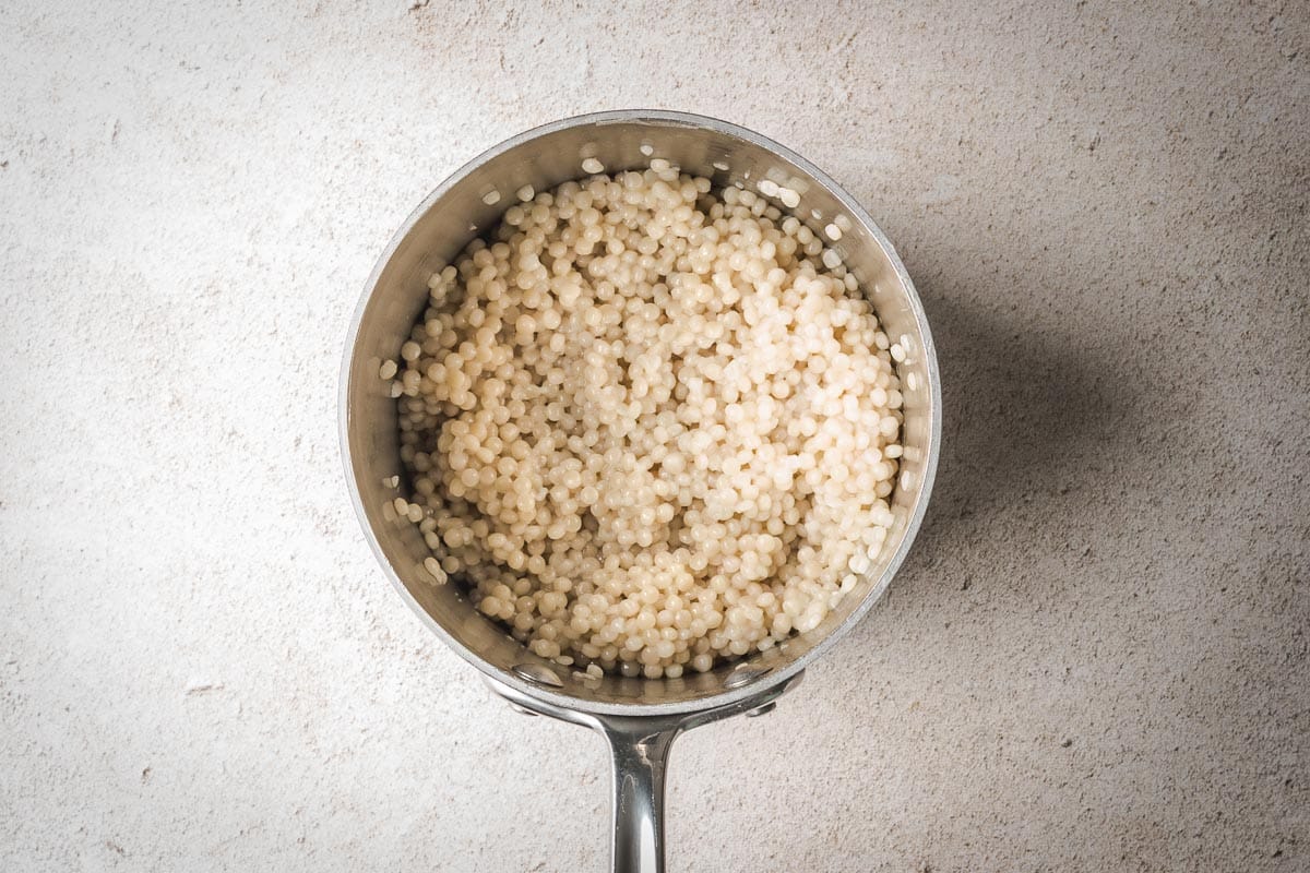 - Boil the couscous – Bring 1½ cups of water to a boil. Stir in the pearl couscous. Reduce the heat to a simmer, cover and cook for 8 to 10 minutes until the liquid has been absorbed and the couscous is tender yet chewy. Set aside to cool.
