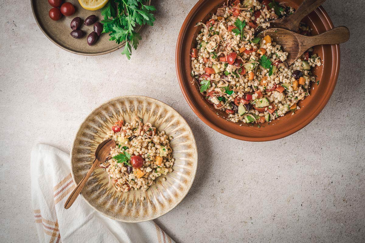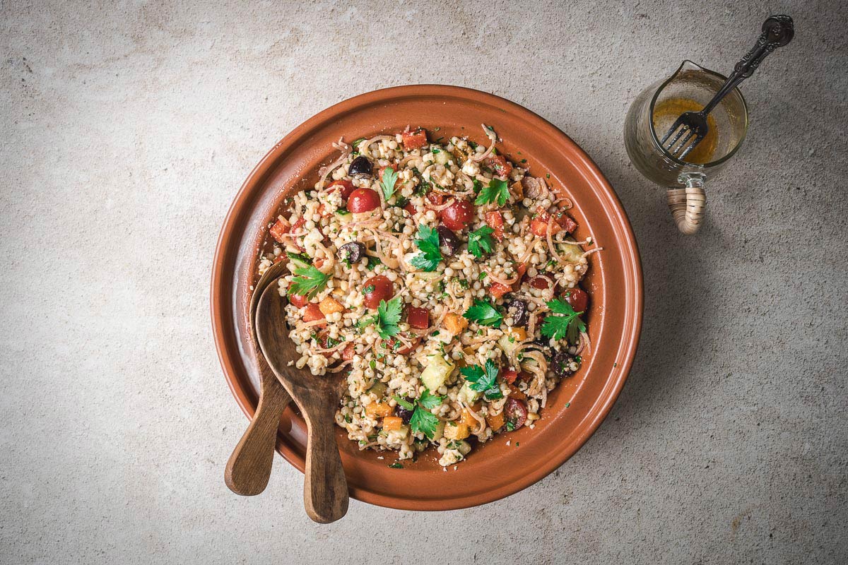 Now, you might think using tiny pasta like pearl couscous would make this salad a lightweight…it’s anything but! The combo of ingredients packs a mighty taste wallop. And the dressing? We’re talking fresh lemon juice, red wine vinegar, and spices that’ll transport you straight to the eastern Mediterranean.