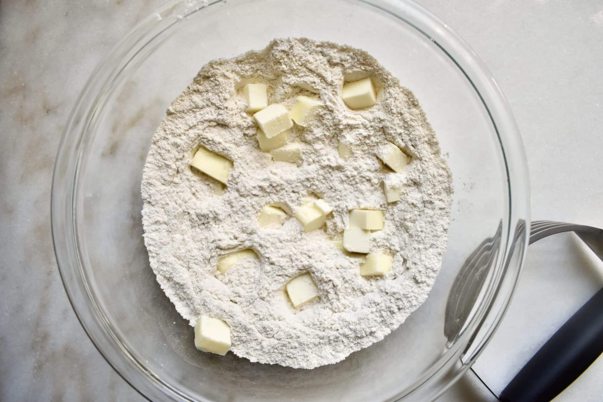 - Add in the cold, cubed butter and use a pastry blender to cut in until crumb-like.