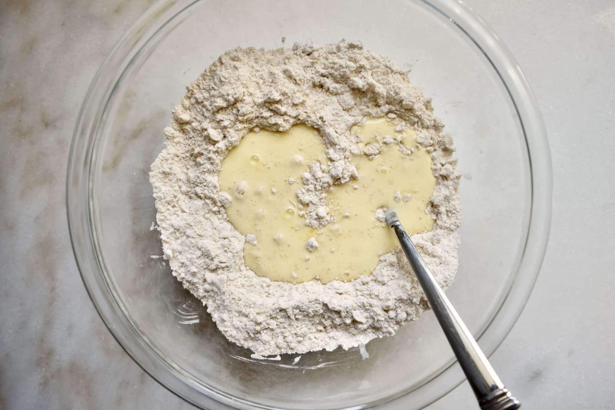 - Using a fork, gently stir in the buttermilk and lightly beaten egg.