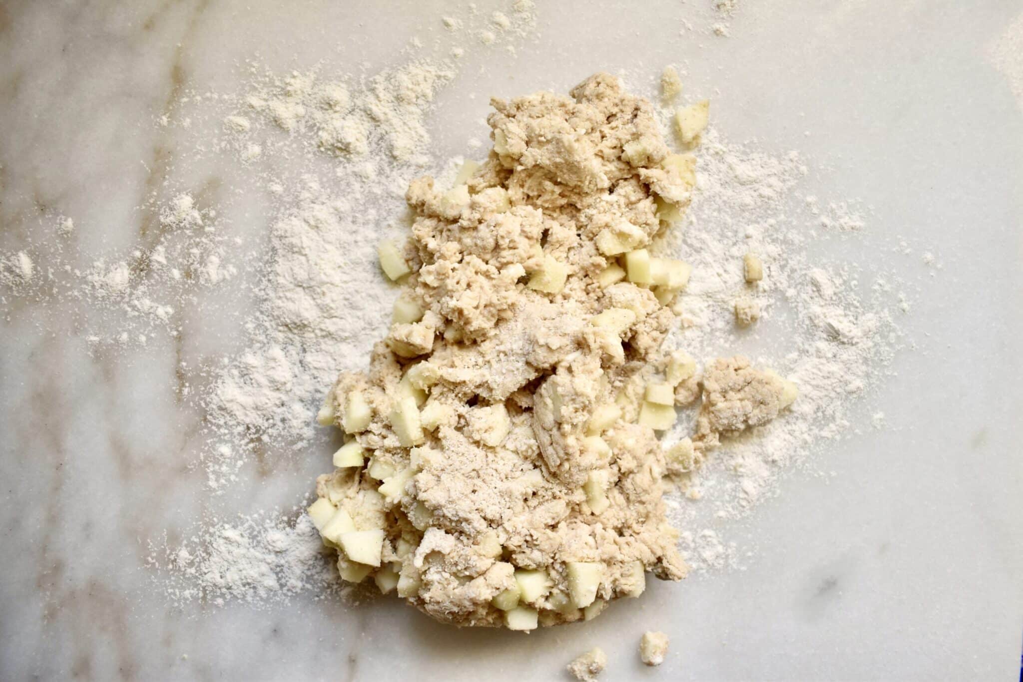- Add in the peeled and diced apple and gently mix. Turn the mixture out onto a lightly floured surface and knead 4-5 times or until it comes together.