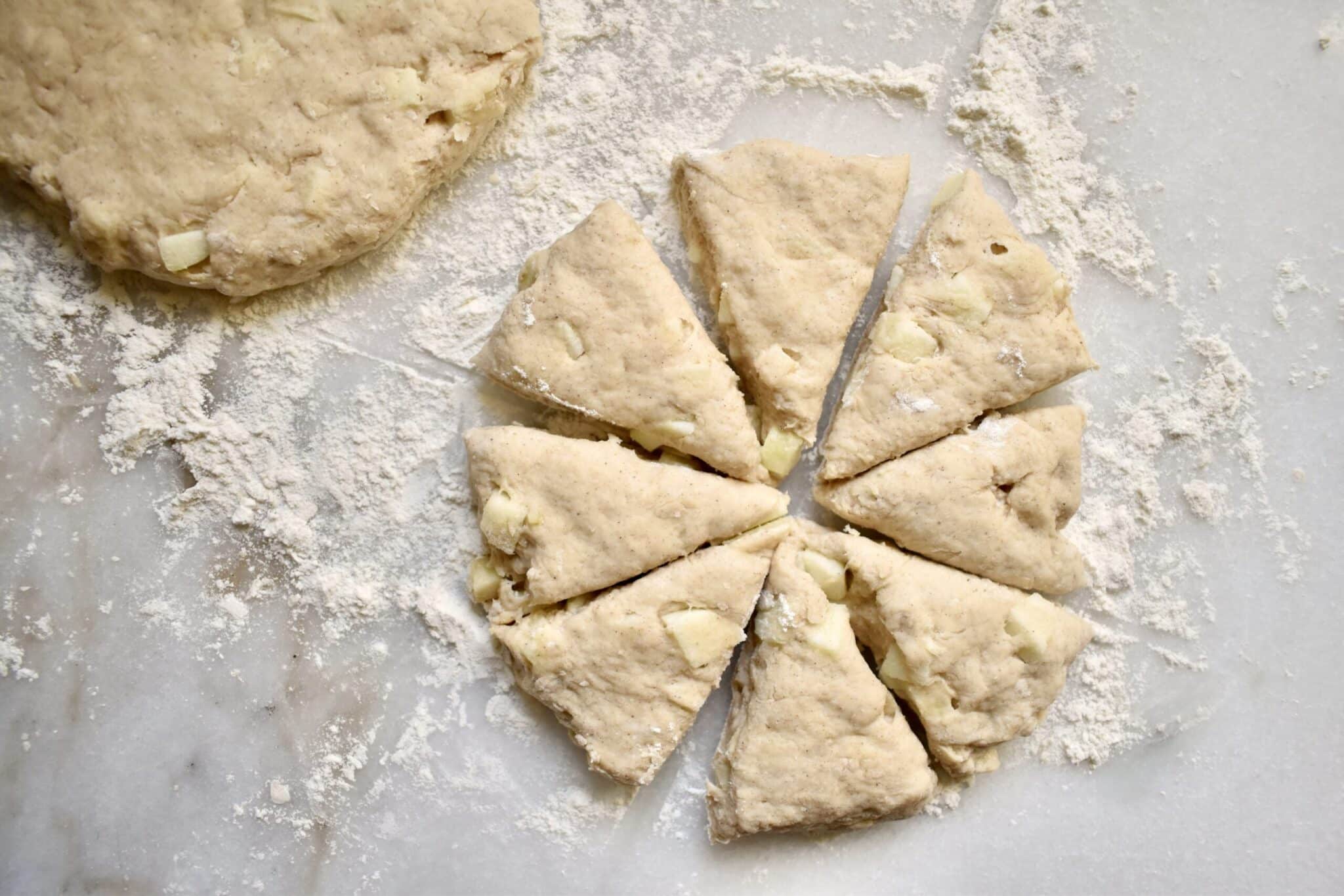 Lastly, add in the apple and slowly mix. The mixture will not be cohesive yet and that’s ok. Turn the mixture out onto a lightly floured surface and knead several times until it starts to come together. Using a bench scraper or knife, divide the dough in half and gently press each section into a 6-inch circle that is about 1/2 inch thick. Cut each circle into 8 pieces and place about an inch apart on a parchment-lined baking sheet. Chill in the refrigerator for about 15 minutes.