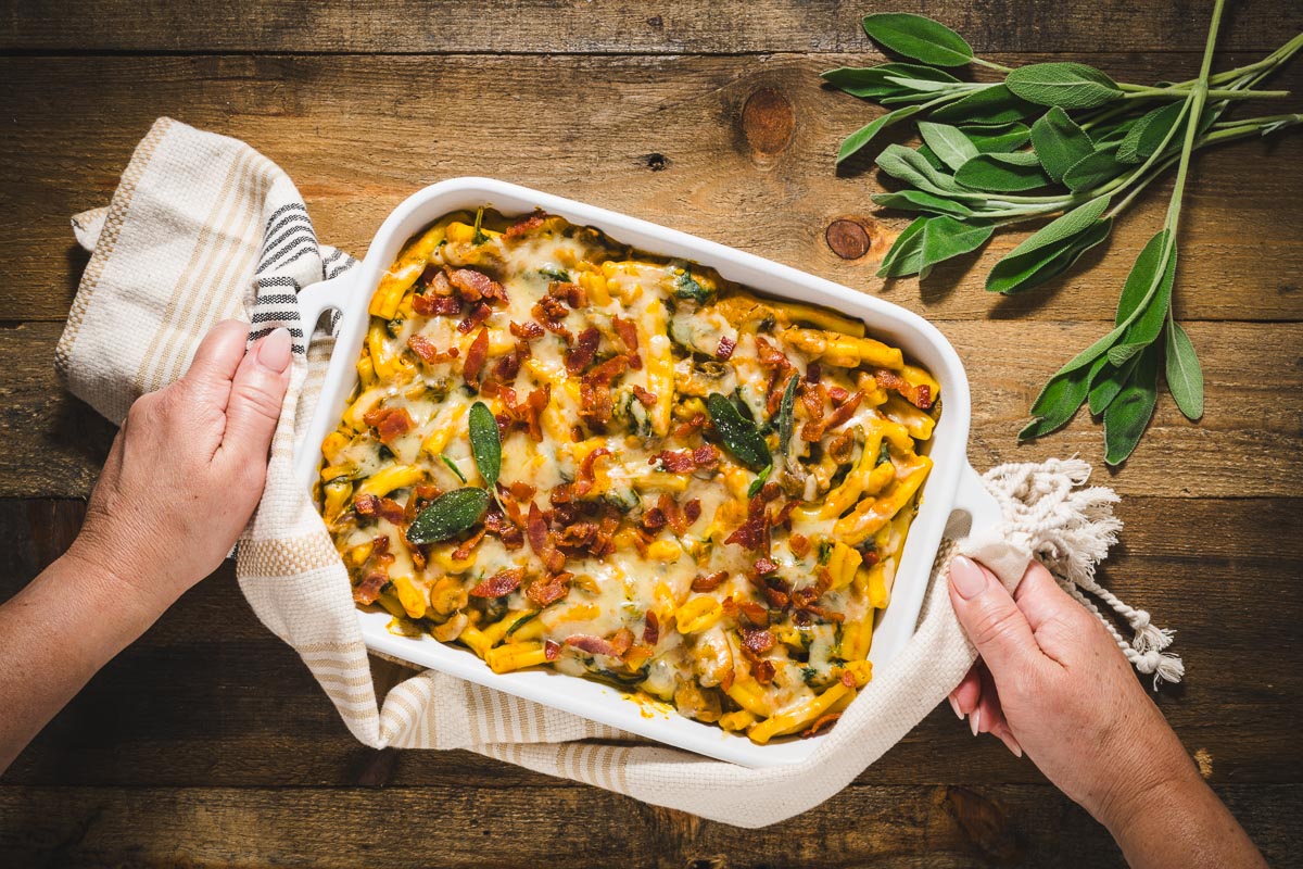 This Creamy Pumpkin Pasta Casserole is the perfect expression of fall flavors, combining seasonal pumpkin and herbs with savory bacon, mushrooms, melty cheese, and that old crowd-pleaser…pasta!