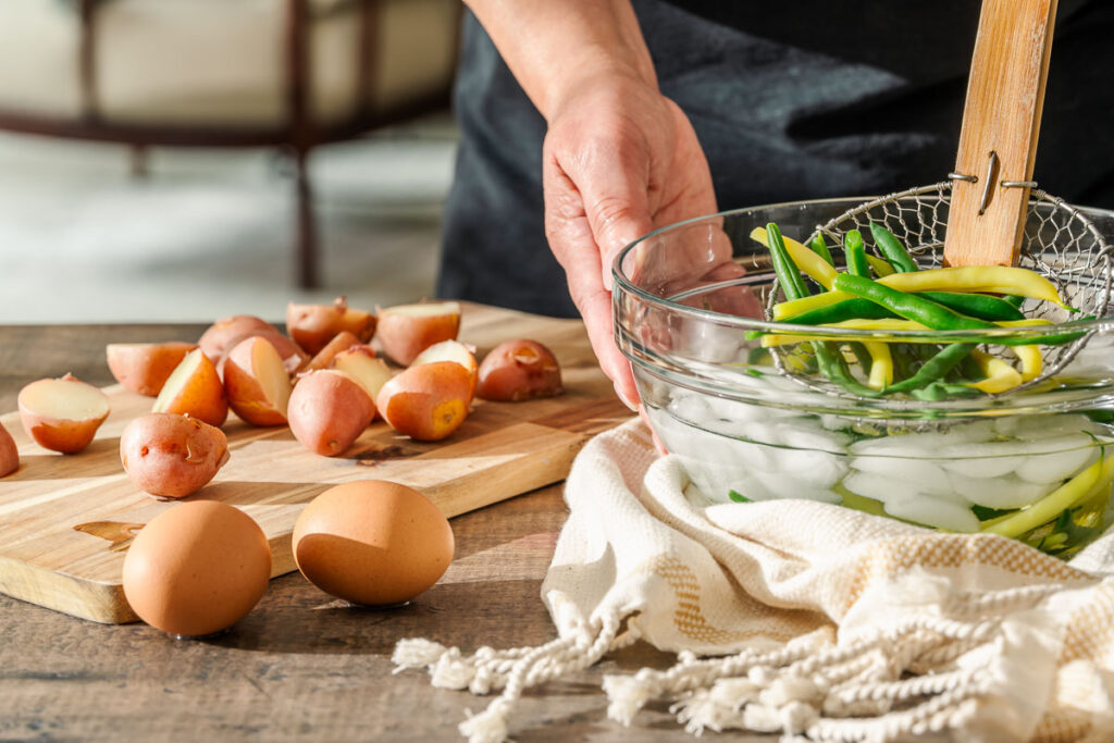 - Bring the pot back to a boil one last time, blanch your green beans or asparagus until bright green and crisp-tender – just 2-3 minutes, then straight into an ice bath to stop the cooking. Drain and set aside on a kitchen towel to dry.