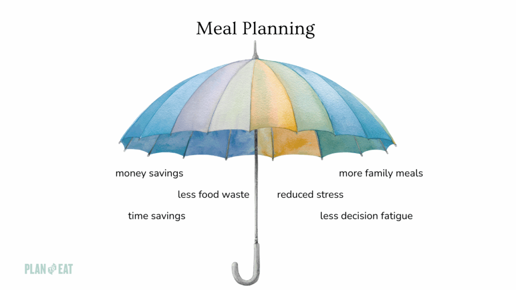 One thing we frequently discuss on the Plan to Eat Podcast is how meal planning is the best New Year’s resolution or new habit to start because it’s an umbrella habit. An umbrella habit is a single habit that positively impacts multiple areas of our lives. These are things like money savings, time savings, less food waste, reduced stress, less decision fatigue, and more family meals together. Think of all those benefits being held underneath the umbrella of meal planning.