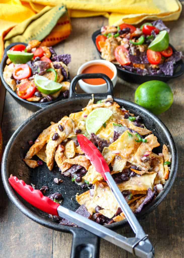 - Layers or not? We like to use layers in a cast iron skillet and make a mountain of nachos, kind of like a nacho lasagna! (And it's fun to serve them in these cute little cast iron mini skillets) However, you can also bake them in one layer on a sheet pan.