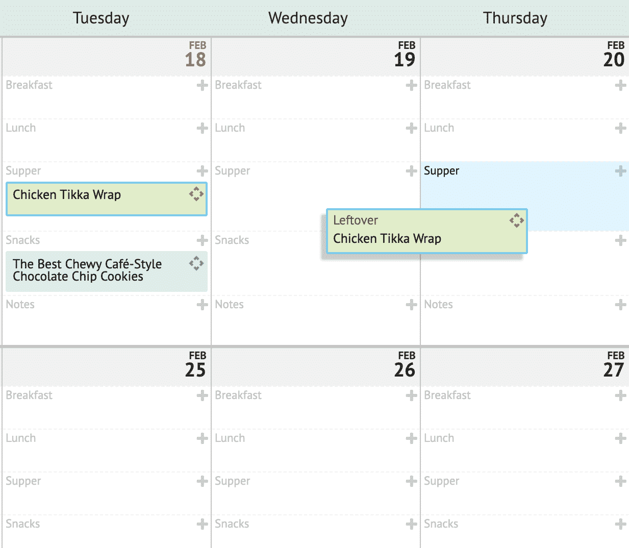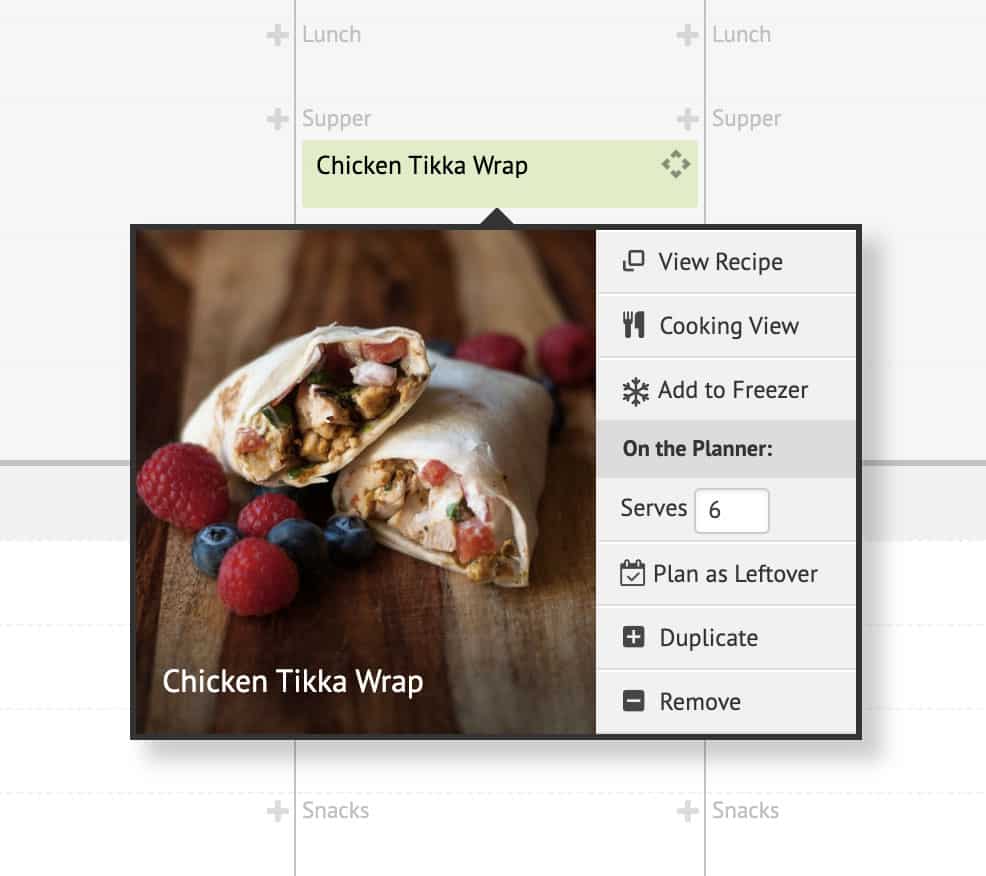You no longer need to use a workaround to plan your leftovers! Simply click on a planned recipe to access the “plan as leftover” button. This will automatically duplicate the recipe with 0 servings (so additional ingredients are not added to your Shopping List) and you can drag that leftover recipe to the date when you plan to eat the meal a second time.