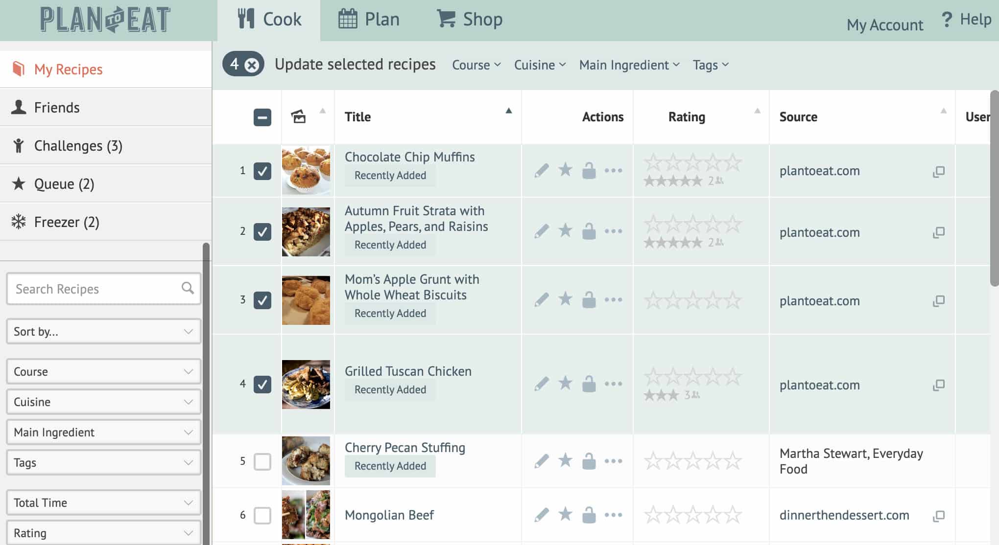 To get started, open your recipe book at www.plantoeat.com/recipes. On the My Recipes page, you can now use the bulk editing options from the Grid View or Table View. If you are using the Table View you can start selecting recipes you want to edit and the actions menu will appear at the top of your screen. If you are using the Grid view, you’ll need to click the Select button to enable the recipes selection mode. Once you have selected recipes you want to update, click on Course, Cuisine, Main Ingredient, or Tags to begin making bulk changes to the recipes you selected.