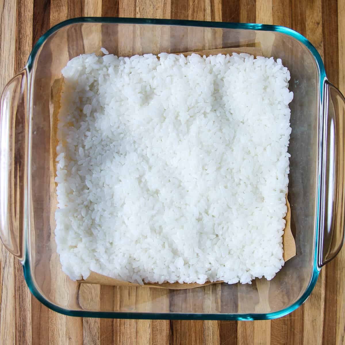 - Rice layer: Use water to wet your hands when pressing the rice into the baking pan to prevent the grains from sticking to your hands.