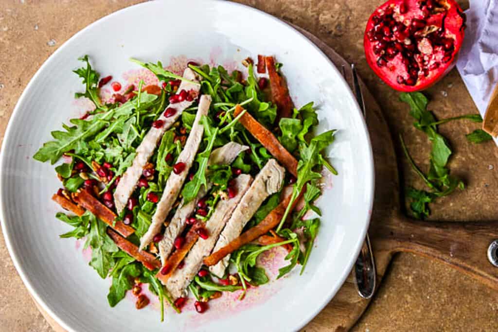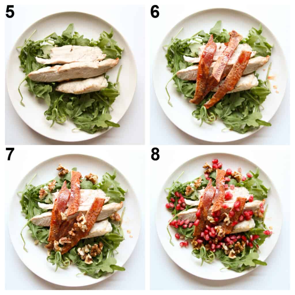 - Divide arugula between 4 plates and add turkey, bacon and walnuts. Scatter pomegranate seeds over each plate and drizzle with vinaigrette.