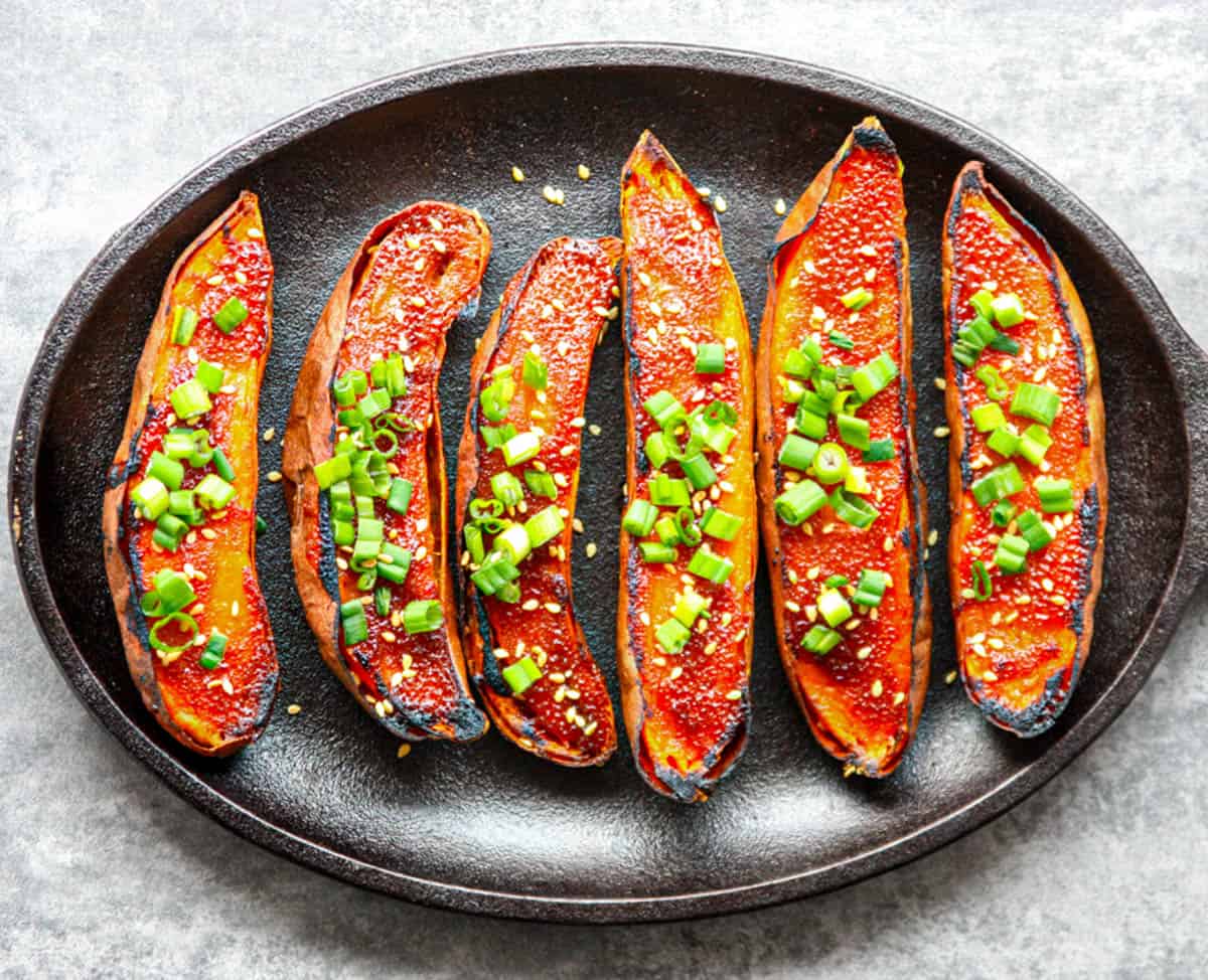 A Miso soy glaze transforms these simple baked sweet potatoes into a dinner party-worthy side dish or feature of your holiday table. A hint of spice from Sriracha is the perfect foil for the this veggie's natural sweetness. Get the recipe: Miso Baked Sweet Potatoes.